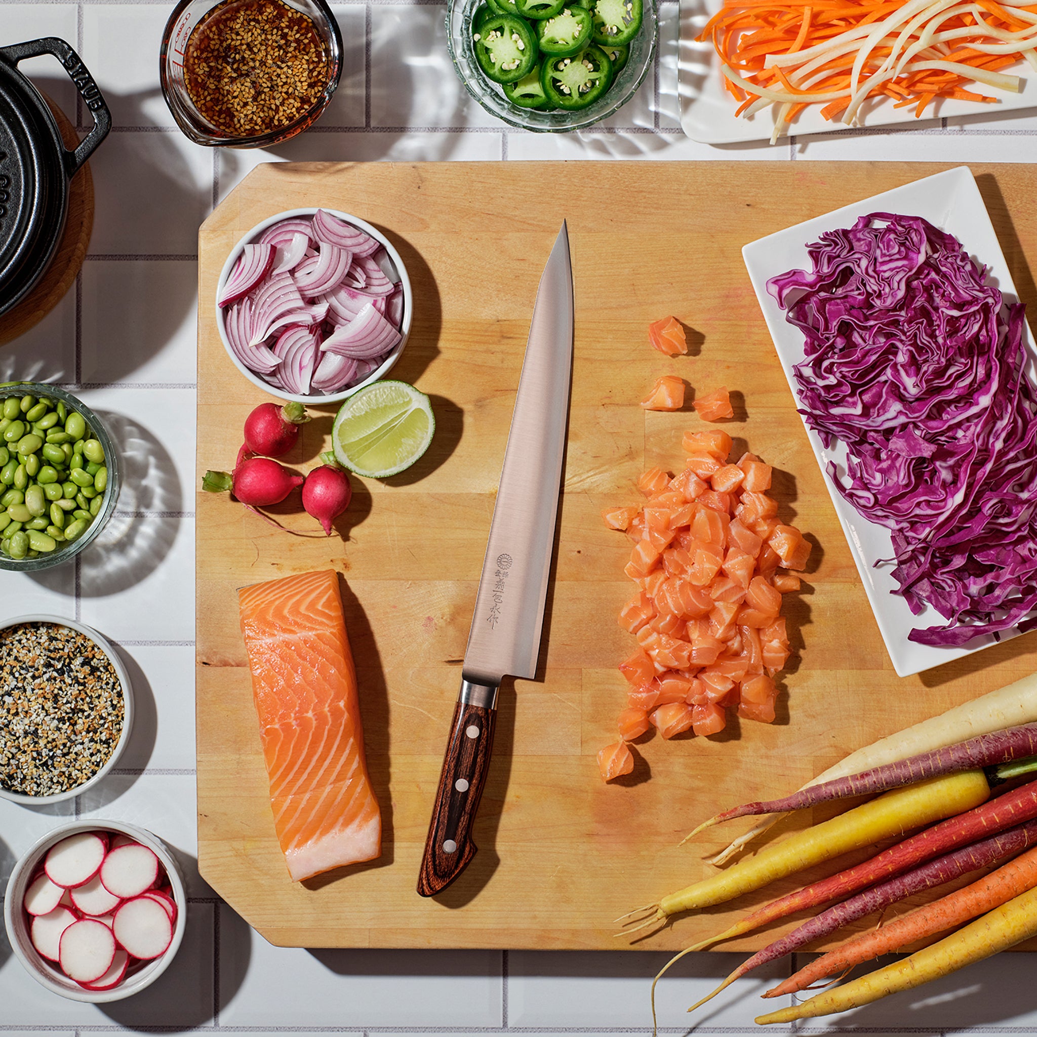 A Japanese slicing knife with a long, narrow blade designed for precise, clean cuts through meat and fish, making it ideal for filleting and portioning,