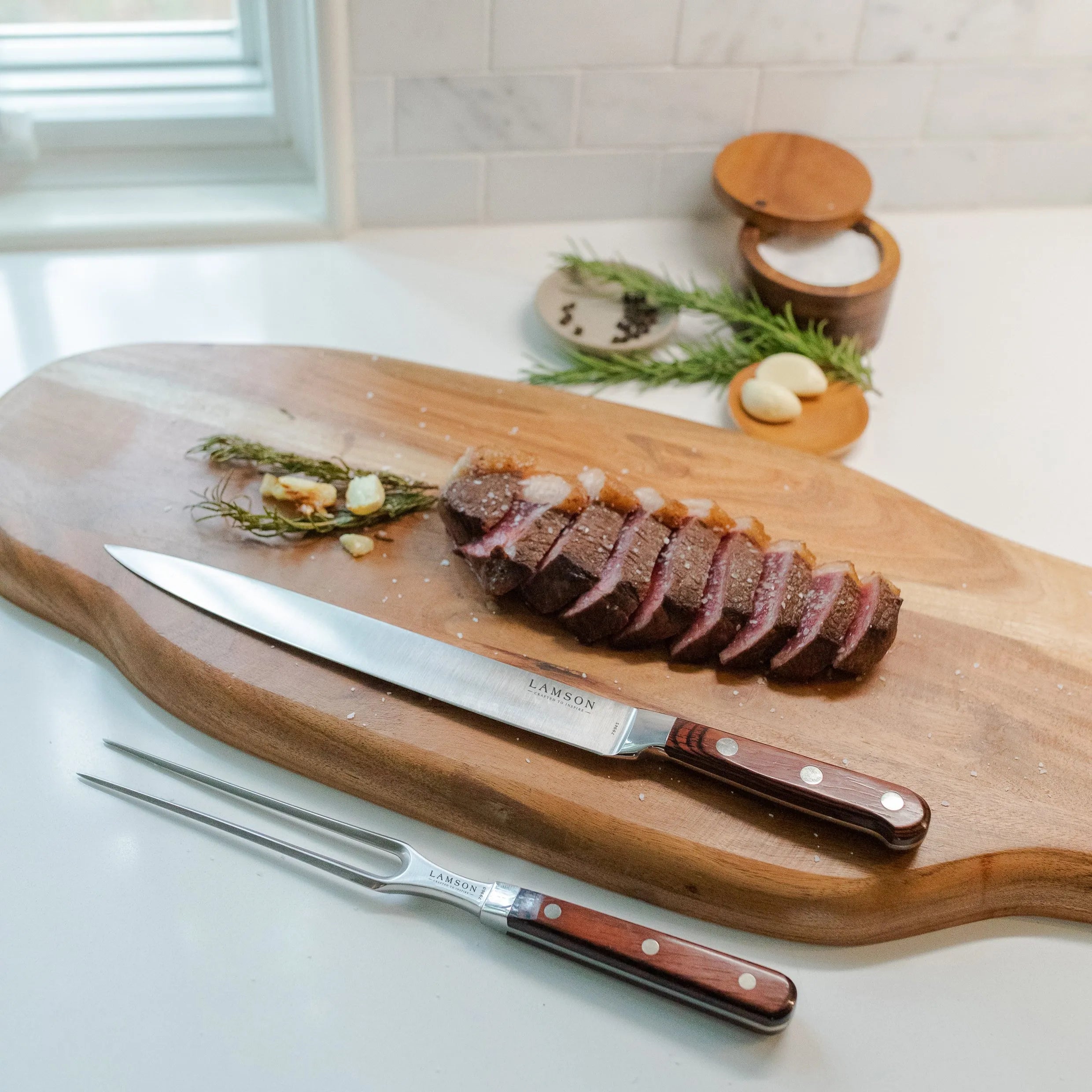 A carving knife is a specialized kitchen tool designed for precision and ease when slicing cooked meats. With a long, narrow blade typically ranging from 8 to 14 inches, it boasts a sharp, pointed tip and a flexible design that aids in controlled slicing. Some carving knives feature serrated edges or grantons (dimples) along the blade, which help reduce friction and prevent food from sticking, ensuring smoother cuts.