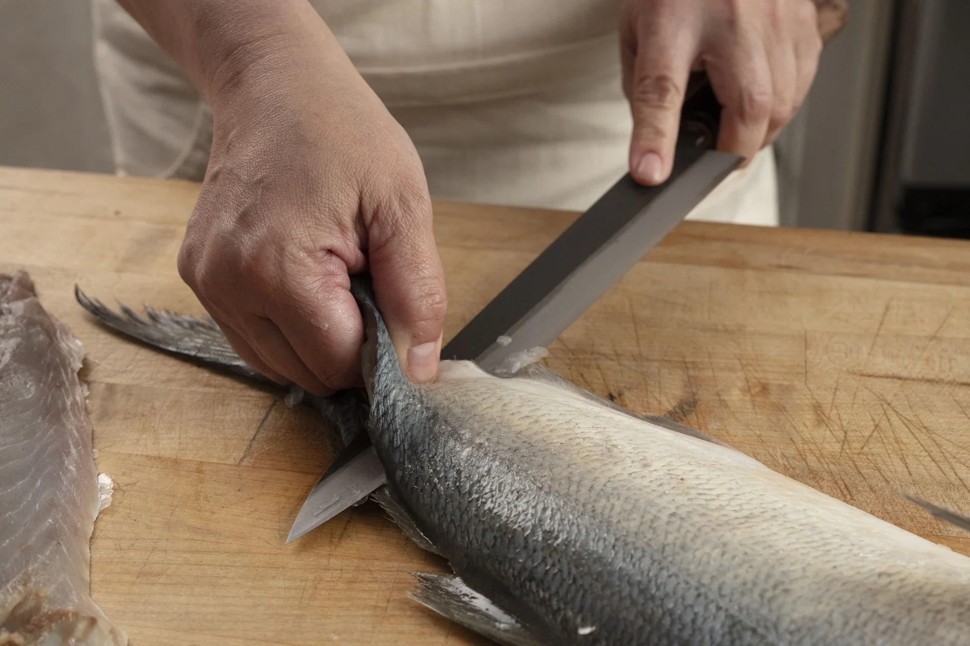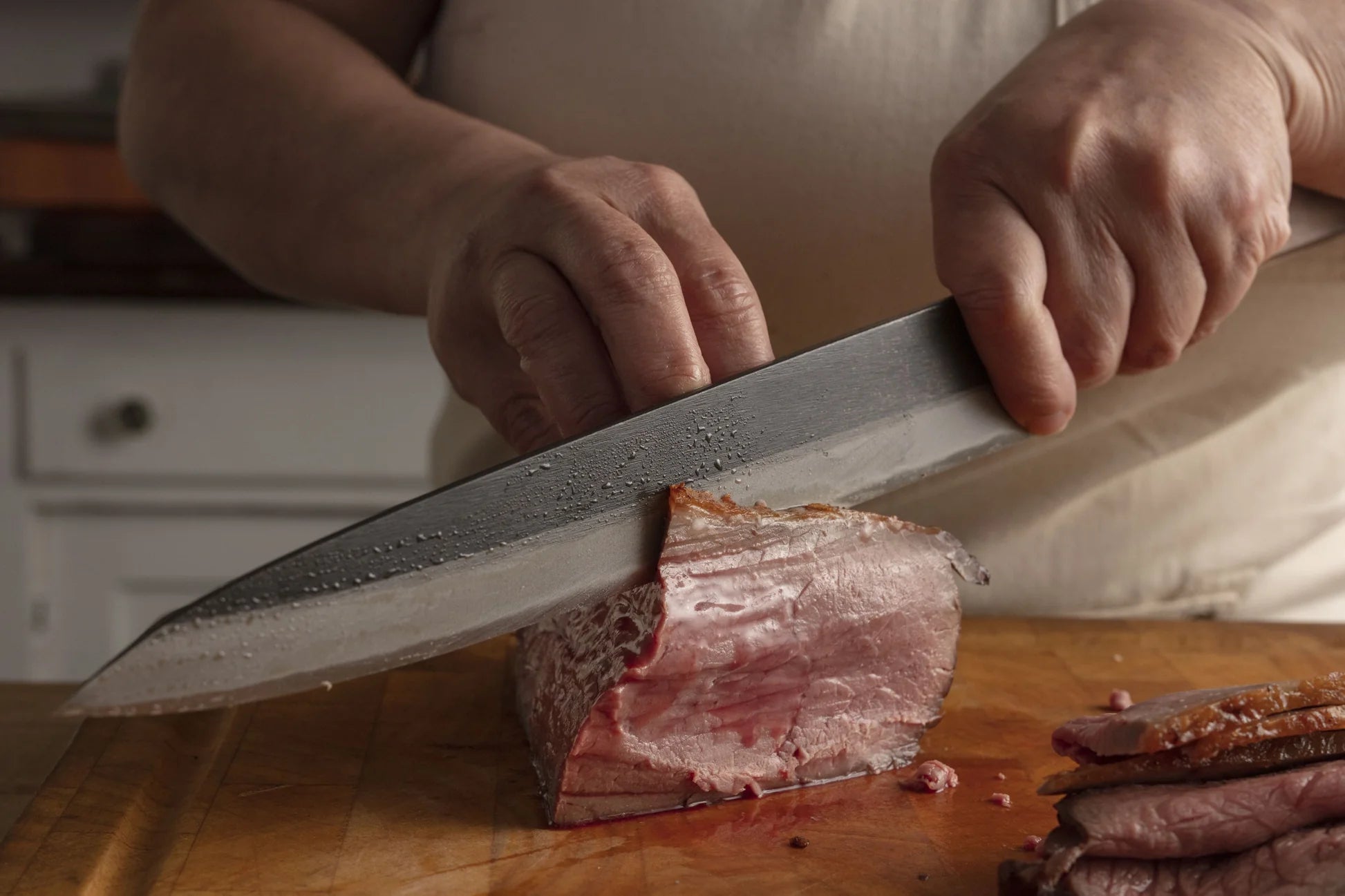 The sujihiki knife’s blade is typically 9 to 12 inches long, narrow, thin, and equipped with a sharp, pointed tip. Its design allows for long, smooth cuts that reduce resistance and help maintain the natural flavor and structure of the meat or fish. This makes it ideal for slicing cooked meats such as roasts as well as cooked or cured fish like or prosciutto.